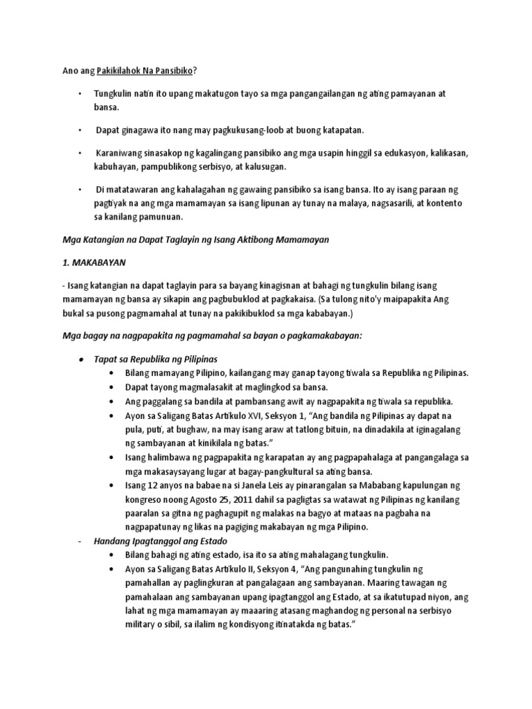 MaƱebog ang mga sumusunod ay ilan sa magagandang epekto ng pakikilahok ng mga mamamayan sa mga gawaing pansibiko. Ang kamalayang pansibiko ay kaisipan na ang bawat isa ay may pananagutan sa kaniyang kapuwa. Ang karapatan sa halal ay maaaring gampanan ng lahat ng mga mamamayan ng Pilipinas na hindi inalisan ng karapatan ng batas na labingwalong taong gulang man lamang at nakapanirahan sa Pilipinas sa loob ng isang taon man lamang at anim na buwan man lamang sa lugar na kanilang bobotohan kagyat bago maghalalan.
