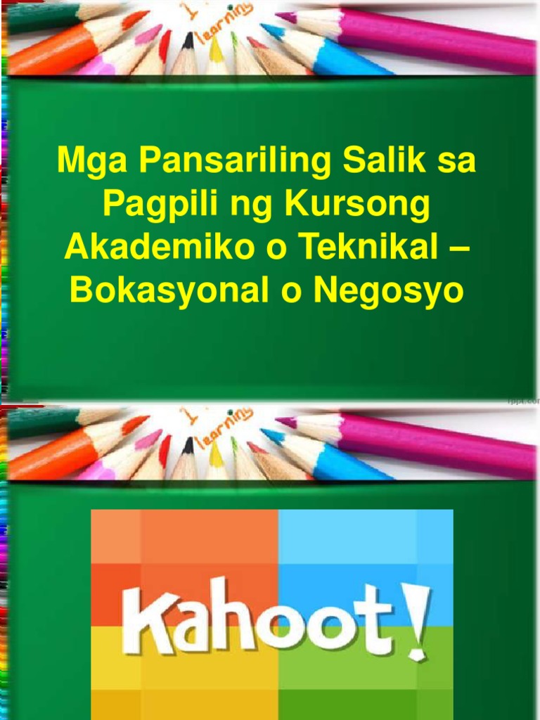 MGA PANSARILING SALIK SA PAGPILI NG KURSONG AKADEMIKO TEKNIKAL-BOKASYUNAL O NEGOSYO Thank you. New ways to present your Powerpoint and Google Slides decks with Prezi Video. Narito ang ilang mga panlabas na salik na nakakaimpluwensya sa pagpili ng kurso o karera mula sa lektura ng Filipinong propesor na si Jensen DG.